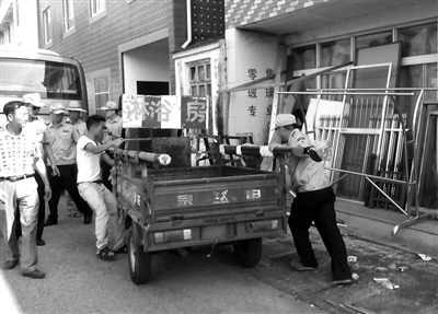 本报讯 近日,黄避岙乡联合贤庠城管中队、大徐路政所等单位对平桥路、中心菜场等脏乱差集中区进行联合执法。(下图)