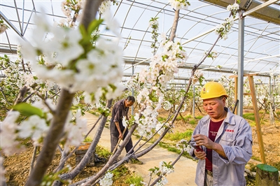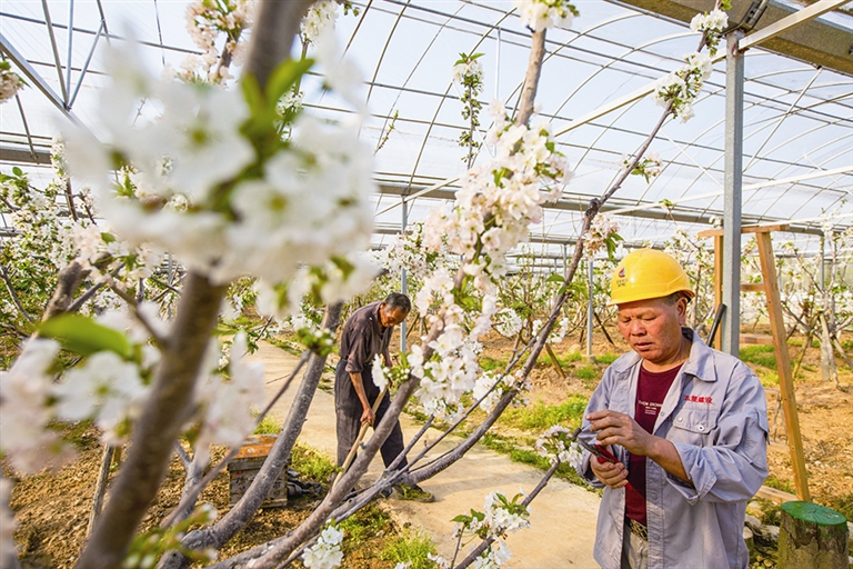 近日,在墙头镇大溪蒋村江南富硒大樱桃种植示范基地,几名果农正在给樱桃树疏花疏果,提高樱桃坐果率。