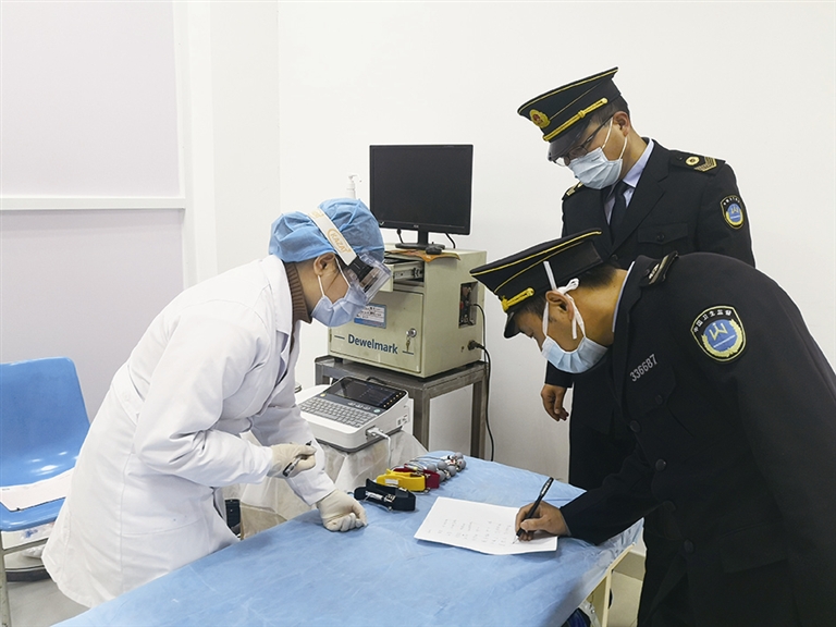 现场,行政执法人员仔细查看了职业健康体检机构的备案资料、医护人员的执业资格和职业健康检查工作流程,逐一查验了体检所用的测听室、DR机放射机房等仪器设备,并对体检中的人员健康筛查、体温检测、体检中医护人员及员工的个体防护、医疗废物处置等疫情防控措施进行了重点督查。