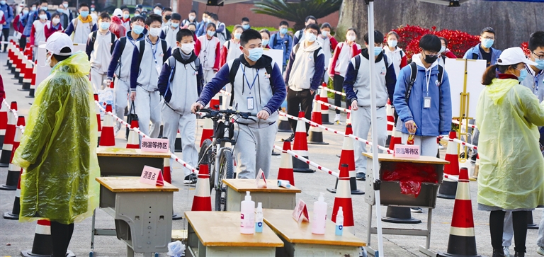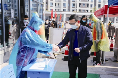 4月13日一大早,象山文峰学校门口,设置起了一排临时防疫监测点。早上7时左右,学生们戴着口罩相互间隔排起长队,依次出示绿码、检测体温,在老师的指挥下安全有序进校。