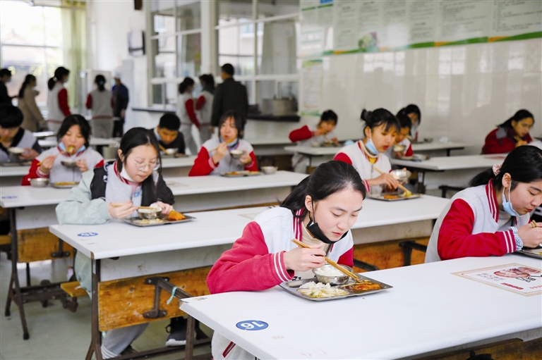 中午时分,墙头学校901、902两个班级的学生从教室门口间隔1米排起长队,分东西两侧楼梯依次下楼,兵分两路来到食堂。经过间隔洗手、体温检测等“重重关卡”,方进入食堂领餐就餐。该校德育副校长鲍良彪说,该校原本可容纳8人的餐桌现改为2人单向而坐,下一步全面开学以后,将开设体艺厅为第二食堂,配合不同年级错峰上下课、分时分段就餐等办法,缓解就餐压力,确保安全就餐。