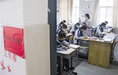 在丹城第二中学教室里,初三老师正在给同学们授课。第一天上课,除了正常上文化课外,还特别开设了防疫知识课堂,向学生强调了防疫要点、重要性等。为了保证上课单人单桌,该校将原来人数较多的6个班级每班拆分成A、B两个班,每班人数控制在20人左右。该校德育副校长俞志坚说,实行AB班后,教学进度、内容、教学质量一样,确保教学同质化。