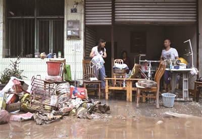 8月18日,洪水过后,雅安市雨城区草坝镇的一户居民在清理家中物品。