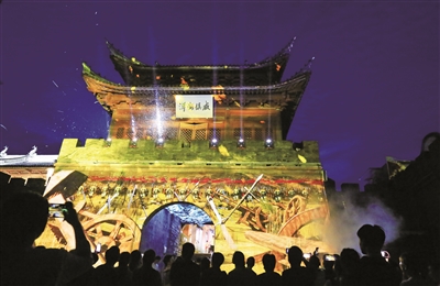 入夏来,石浦渔港古城开启夜游模式,遍地开花的“灯光秀”给老街古巷披上了“不夜”的霓裳。在瓮城城楼,戚继光抗倭的故事在城墙上“再现”,市民和游客们耳闻鼓角争鸣,恍如进入了“时光隧道”。(特约记者 谢定伟)