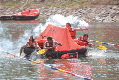本报讯 7月8日,在石浦北门水库,一场救生艇筏操纵比赛紧张进行中,翻转、登筏、划船……选手们各尽所能,加油声、呐喊声响成一片;设在宁波海洋职业技术学校的渔业知识竞赛现场,选手们拼知识、比手速,气氛紧张热烈。