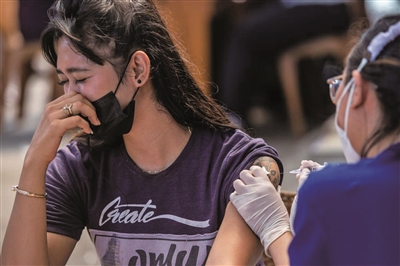 7月12日,医务人员在印度尼西亚雅加达一处人口密集区的移动疫苗接种点为居民接种新冠疫苗。