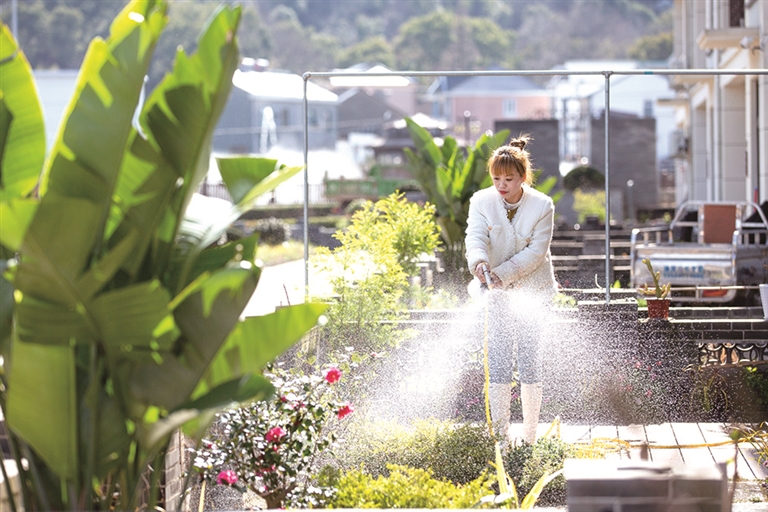 该村“中式风貌建筑示范点”于去年建成,目前农户已陆续入住。为打造美丽庭院、扮靓美丽乡村,上周,该镇妇联邀请花开俱乐部成员对各户庭院进行专业设计,根据地理位置及光照条件布置绿植花卉,使庭院花艺与建筑风貌相得益彰。