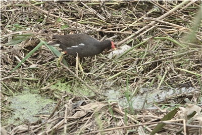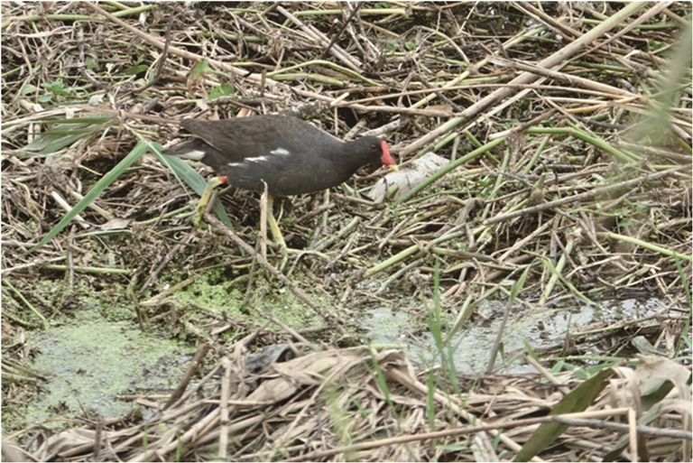 形态特征:中型涉禽,体长24-35厘米。嘴长度适中,鼻孔狭长;头具额甲,后缘圆钝;嘴和额甲色彩鲜艳。翅圆形,第2枚初级飞羽最长,或第2枚和第3枚初级飞羽等长,第1枚约与第5枚或第6枚等长。尾下覆羽白色。趾很长,中趾不连爪约与跗蹠等长。趾具狭窄的直缘膜或蹼。通体黑褐色,嘴黄色,嘴基与额甲红色,两胁具宽阔的白色纵纹,尾下覆羽两侧亦为白色,中间黑色,黑白分明,甚为醒目。脚黄绿色,脚上部有一鲜红色环带,亦甚醒目。游泳时身体露出水面较高,尾向上翘,露出尾后两团白斑很远即能看见。