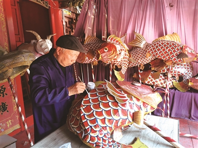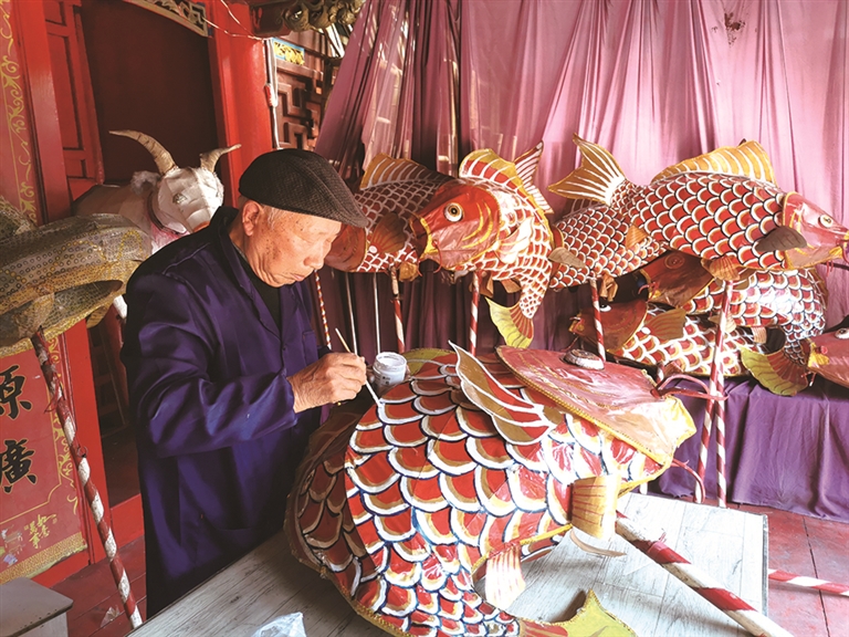 这些鲤鱼灯与生肖灯,有些需要重新上色,有些因年头久了需要重新制作,是一个“大工程”。为此,年近九旬的马布银,整日都在石浦宋皇宫里忙碌着。