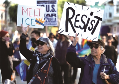当日,市民在美国加利福尼亚州旧金山参加游行,抗议美国对委内瑞拉的军事行动,并反对美国联邦执法人员在明尼苏达州的暴力执法行为。